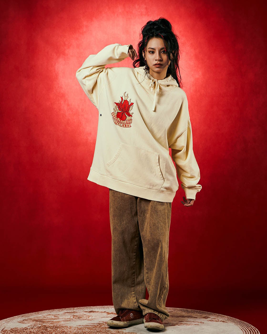 Flames, flowers, and fiery red graphics combine to create the visual aesthetic of this fly hoodie. Cop this unique hoodie to level up your layering game this season.