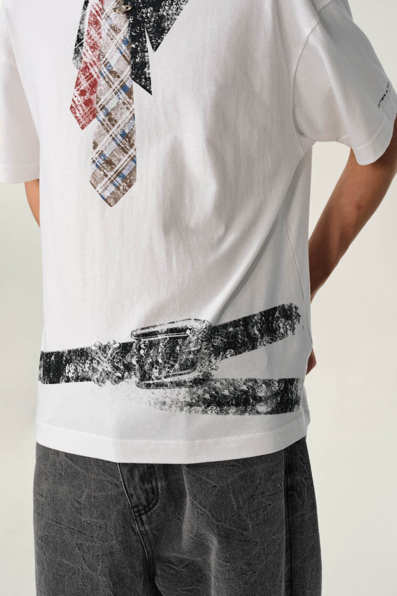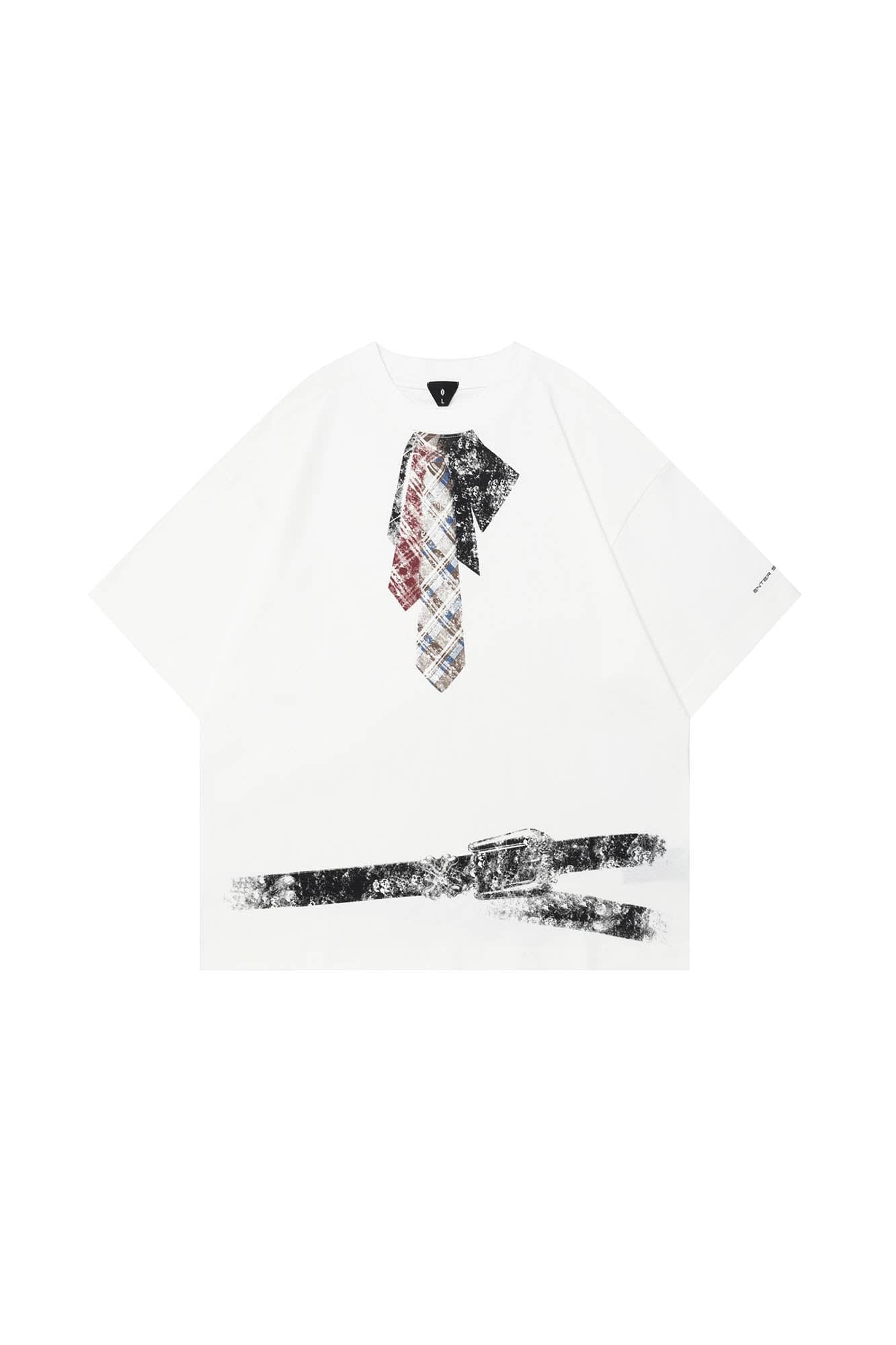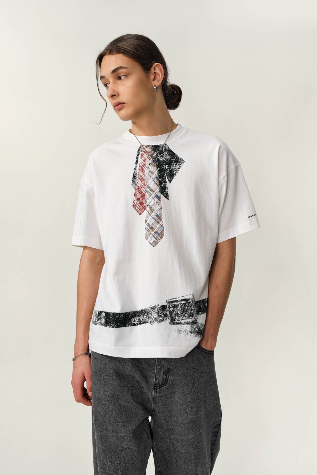 The Tie-Belt Graphic T-Shirt brings ironic sophistication to laid-back streetwear. Printed ties at the neckline play against distressed belt graphics along the lower front and back, creating a layered illusion of accessorizing. Each print is rendered with a worn, vintage effect, giving this design a playful, fashion-forward stance.