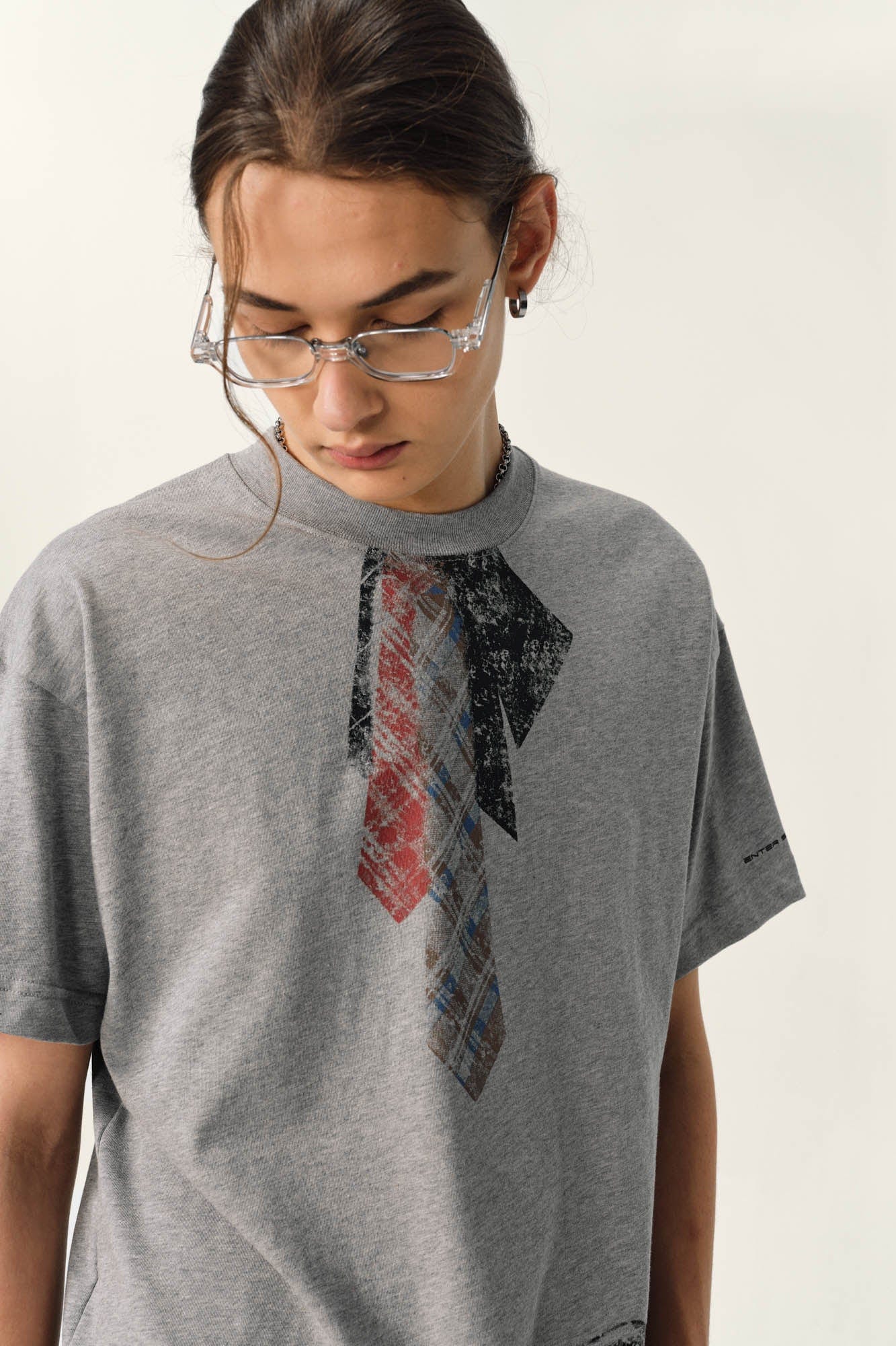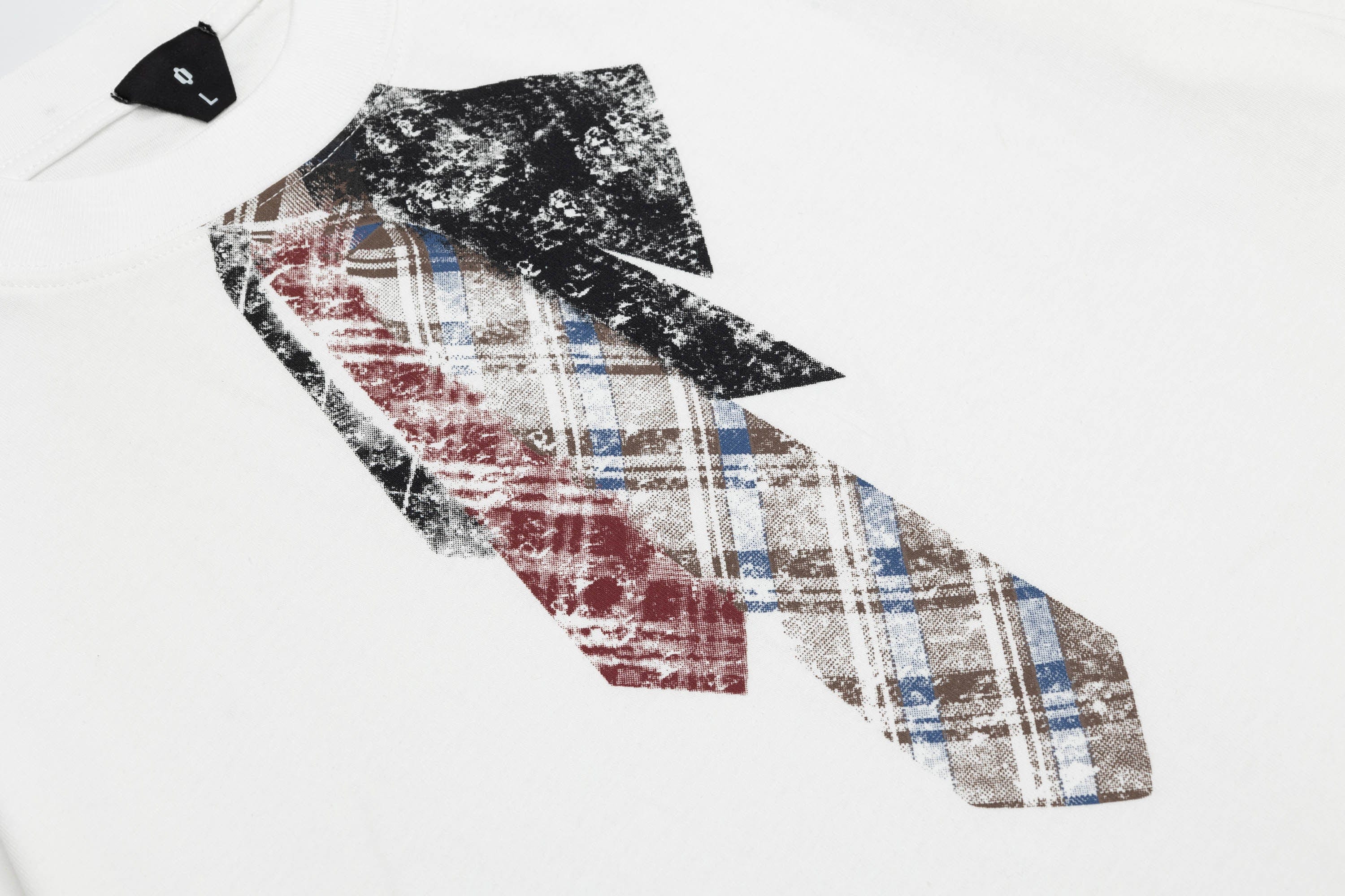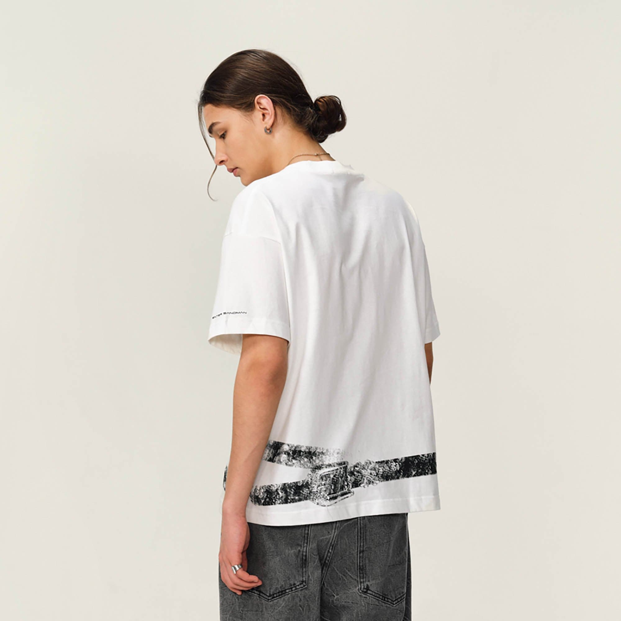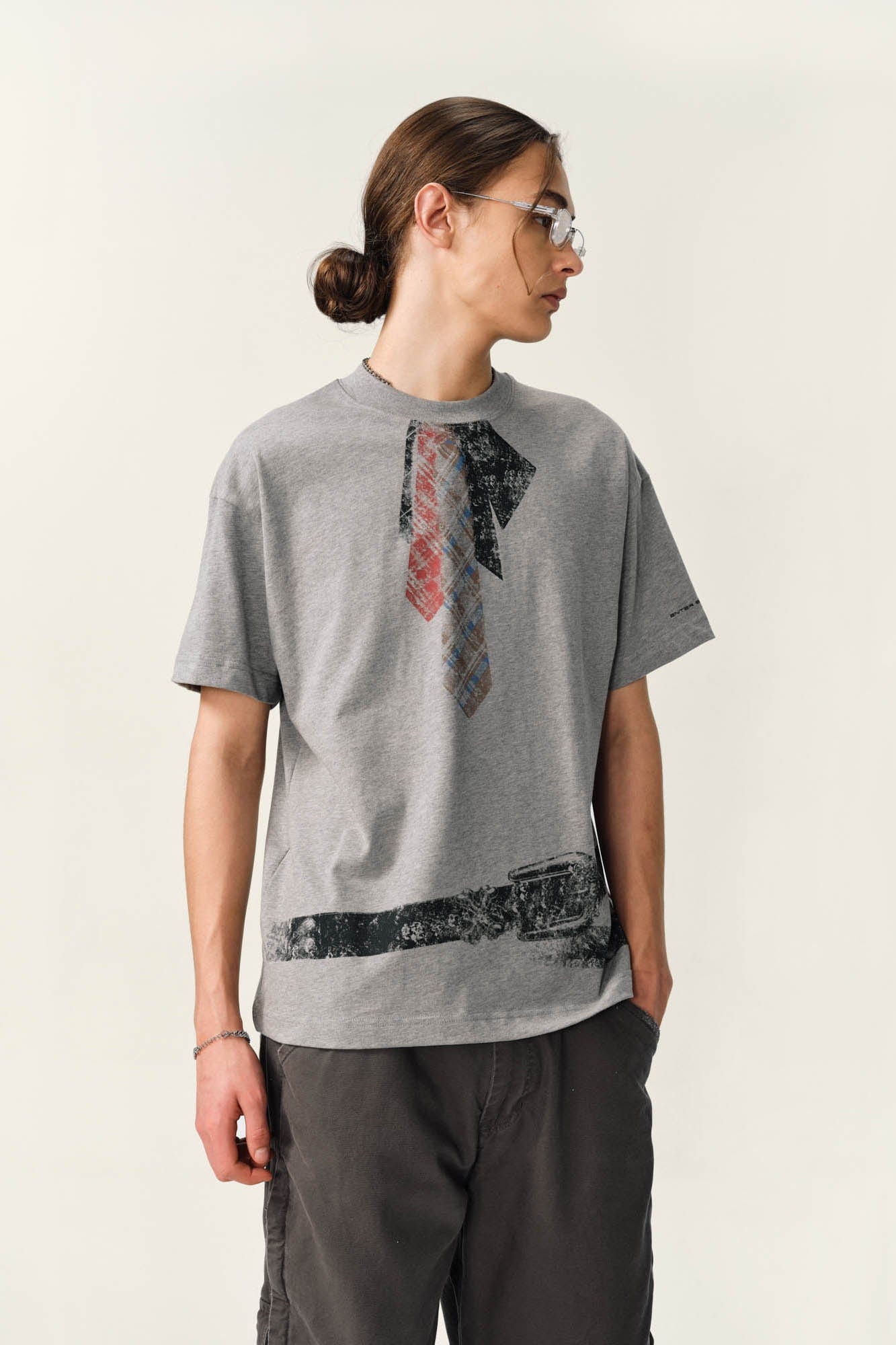 The Tie-Belt Graphic T-Shirt brings ironic sophistication to laid-back streetwear. Printed ties at the neckline play against distressed belt graphics along the lower front and back, creating a layered illusion of accessorizing. Each print is rendered with a worn, vintage effect, giving this design a playful, fashion-forward stance.