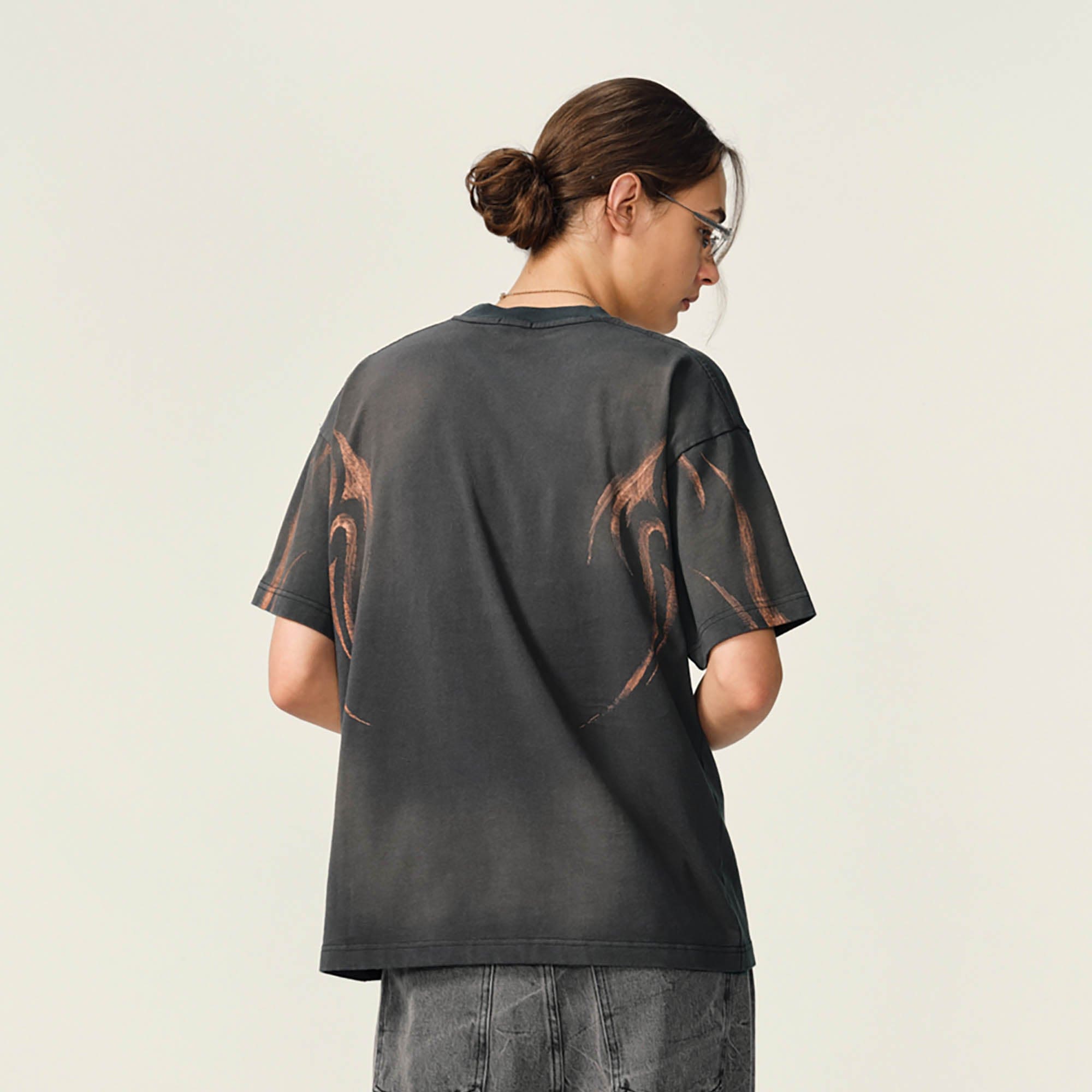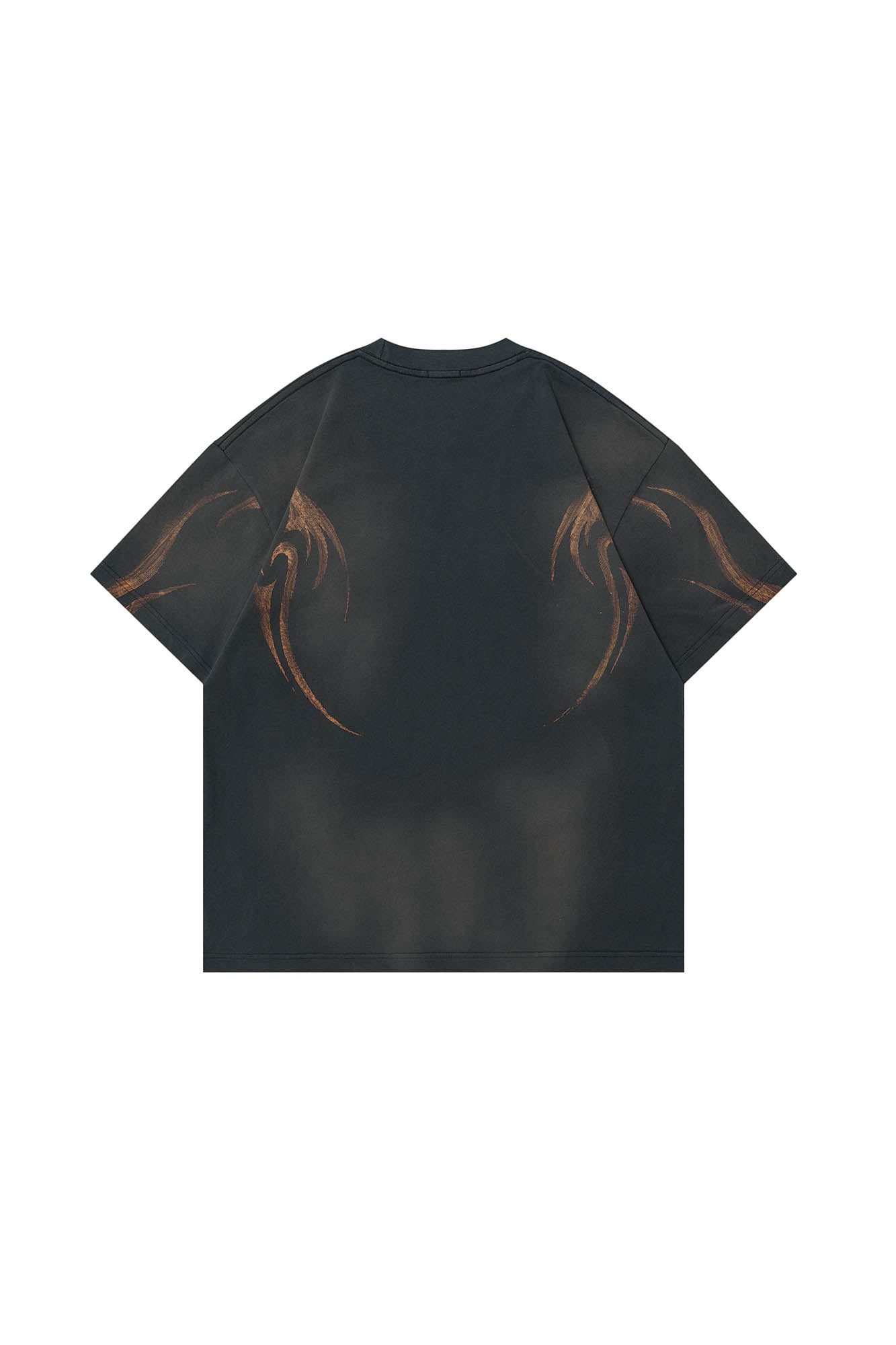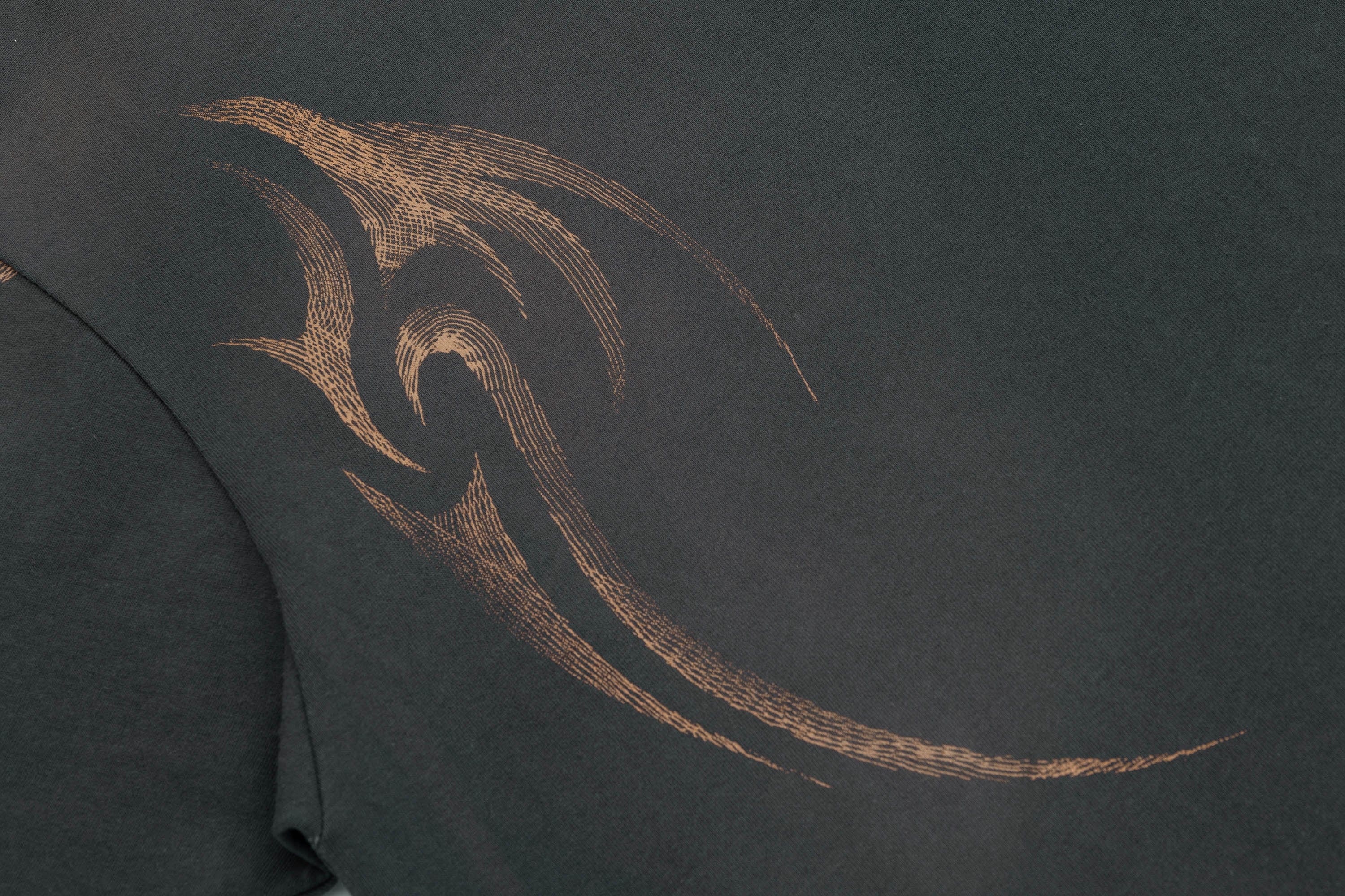 The Tribal Flame Smoke-Washed T-Shirt is a visual powerhouse with smoky undertones. Both the front and back feature sharp-edged tribal flame graphics, rising through a washed finish that mimics the movement of smoke. This dynamic treatment transforms a classic silhouette into a fluid canvas of texture and intensity.