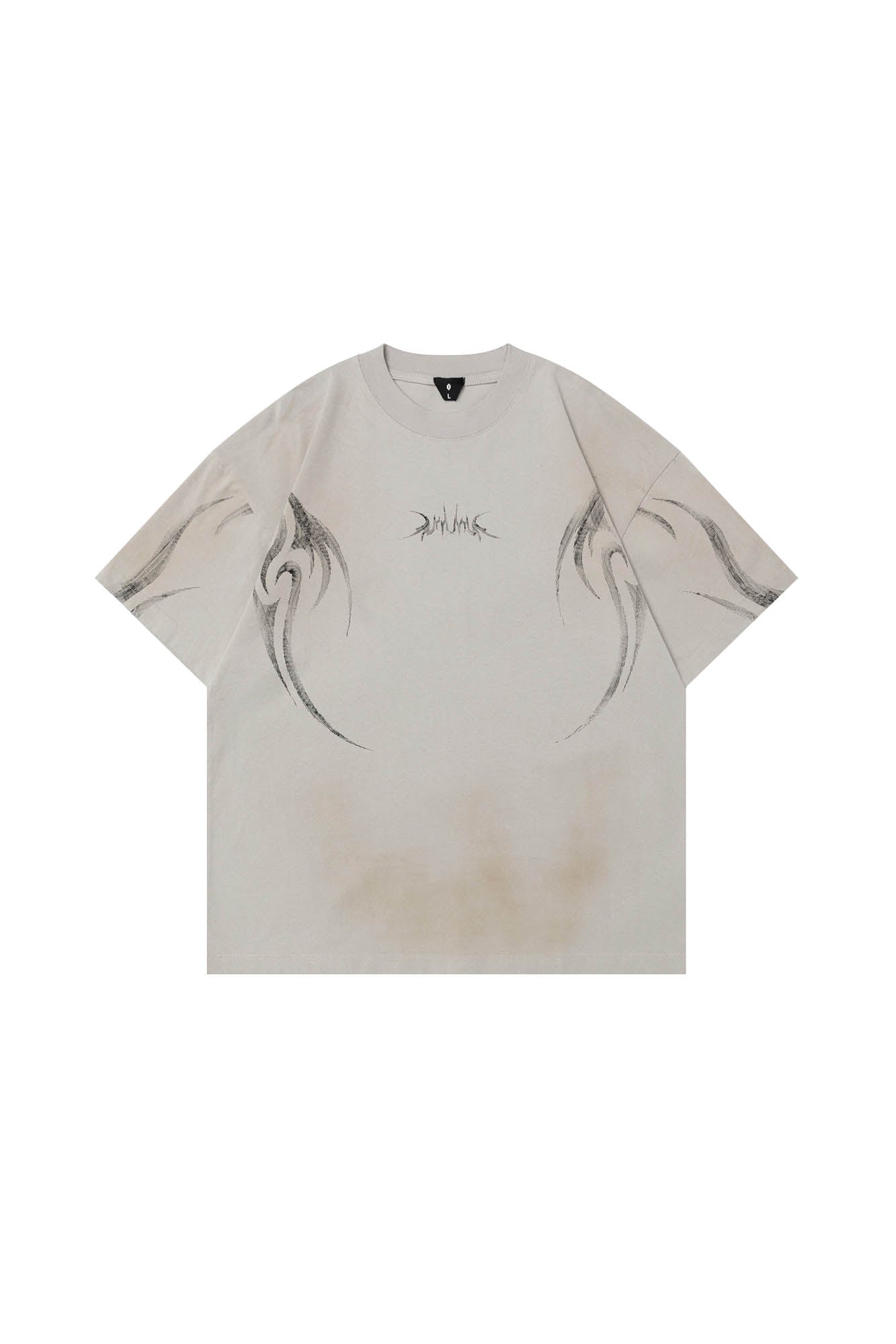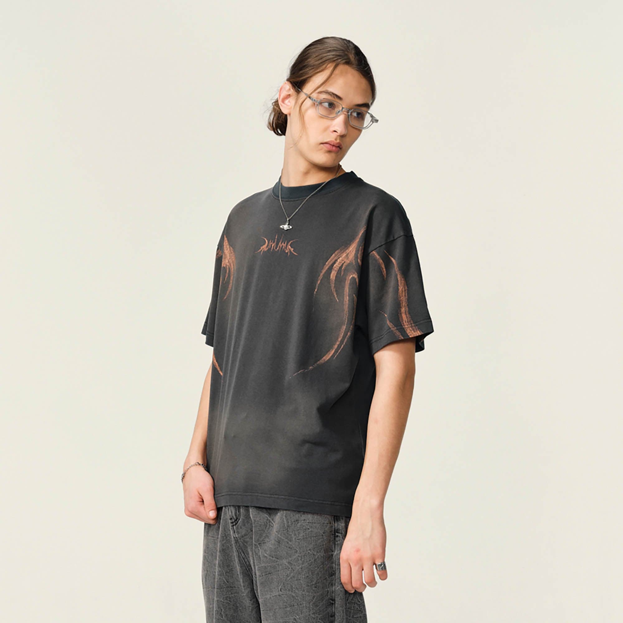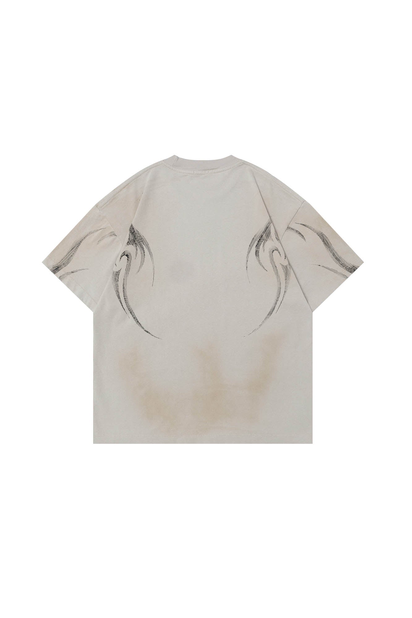 The Tribal Flame Smoke-Washed T-Shirt is a visual powerhouse with smoky undertones. Both the front and back feature sharp-edged tribal flame graphics, rising through a washed finish that mimics the movement of smoke. This dynamic treatment transforms a classic silhouette into a fluid canvas of texture and intensity.